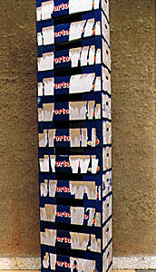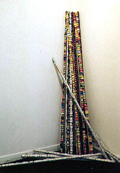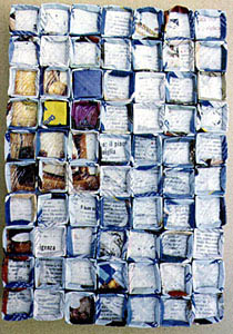 The boxes used in fruit and vegetable markets become constructive modules that divide space in a regular way like the backs of book lining a book-shelf. This way of constructing also transforms space into a landscape that has a potentially infinite growth, like the most Dionysian of agglutinations and wild proliferations. The regular marking of space also alludes to problems of the un/measurability of the time flow (often he titles refer more or less openly to time). Lists, archives, encyclopaedias, libraries (Babelian), calenders... all labyrinthine figures attempting to understand, codify, catalogue, and capture the flow of reality, and they are all figures that are to be found in Formenti's work. With the printed adverts which are slipped under car windscreen-wipers she creates little boxes. They are useless microscopic vaults, nests for fleas, hives for farming dust. She is always fed up with it all. In her works they have a chromatic function, like the pieces of a mosaic, or of a paradoxical "ephemeral or precarious monument". In order to fold these sheets, that all have the same monotonous creases, she repeats mechanically certain gestures of the hands, a tic of modern times. She folds repeatedly and repeats folding in the middle of other things, not in the isolation of the studio but more often than not when around and about, along the road, during her travels from one place to another. It is an automatic gesture that has no need to be controlled by the eyes: it is as though she saw with her hands. |