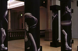 The photographs are of a woman dressed in gym gear whose body image has been digitally manipulated on a computer to stretch around the cylinder. In some cases her body parts fold round to meet themselves; arms and legs are elongated giving a sense of beginning and ending becoming melded. In others they are simply stretched to appear grotesque such as in the image entitled Double Breast which was used to advertise the exhibition. The expressions on the woman's face range from a grimace of pain at the exertion to a grin of delight. Based on the artists' experiences in the gym of (in particular women's) bodybuilding, Muscles has itself been formed to 'explore ä different perspectives on the body.' The manipulations show the process of how shape can be moulded during the body building experience. The spatial regularity of the pillars themselves works well to juxtapose the idea of uniformity with distortion, both features of this process.